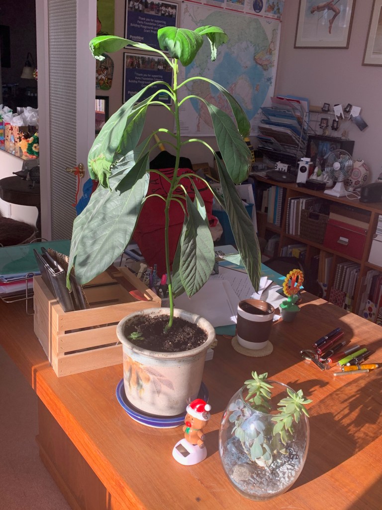 Over time I noticed that once sprouted, the avocado is tender and fragile. I have had several make it to 6-10″ in height but then the leaves died and the plant thereafter too. The one that prompted this writing has by far outlived and outgrown all its predecessors. It has also helped me accept and contemplate the impact of Covid-19 and working from home. Watching it grow has given me comfort in the future and some needed distractions from the pandemic that is so harsh on so many. The succulents have also added to the enjoyment of growth. I am more aware of each day’s progress. I have even learned that succulent leaves will become tipped/ringed with red and that is a good thing as they are blushing and really enjoying their space.